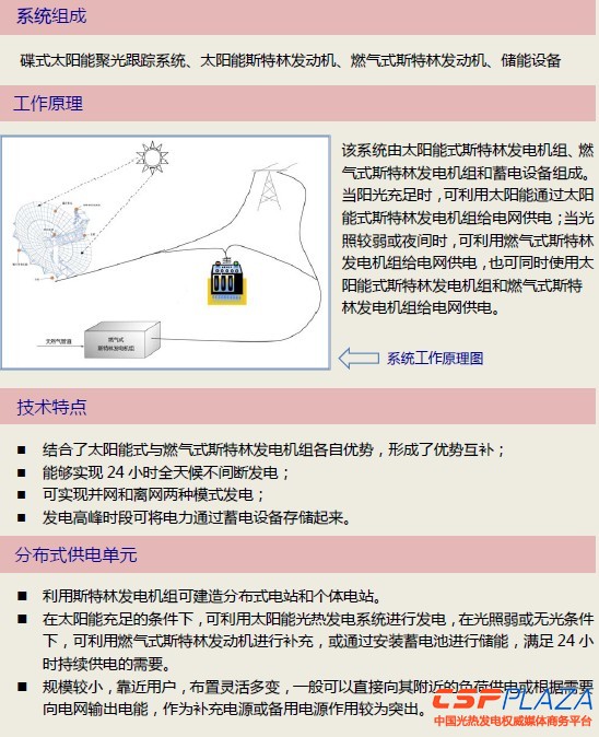 該系統由太陽能式斯特林發電機組、燃氣式斯特林發電機組和蓄電設備組成。當陽光充足時,可利用太陽能通過太陽能式斯特林發電機組給電網供電;當光照較弱或夜間時,可利用燃氣式斯特林發電機組給電網供電,也可同時使 ...