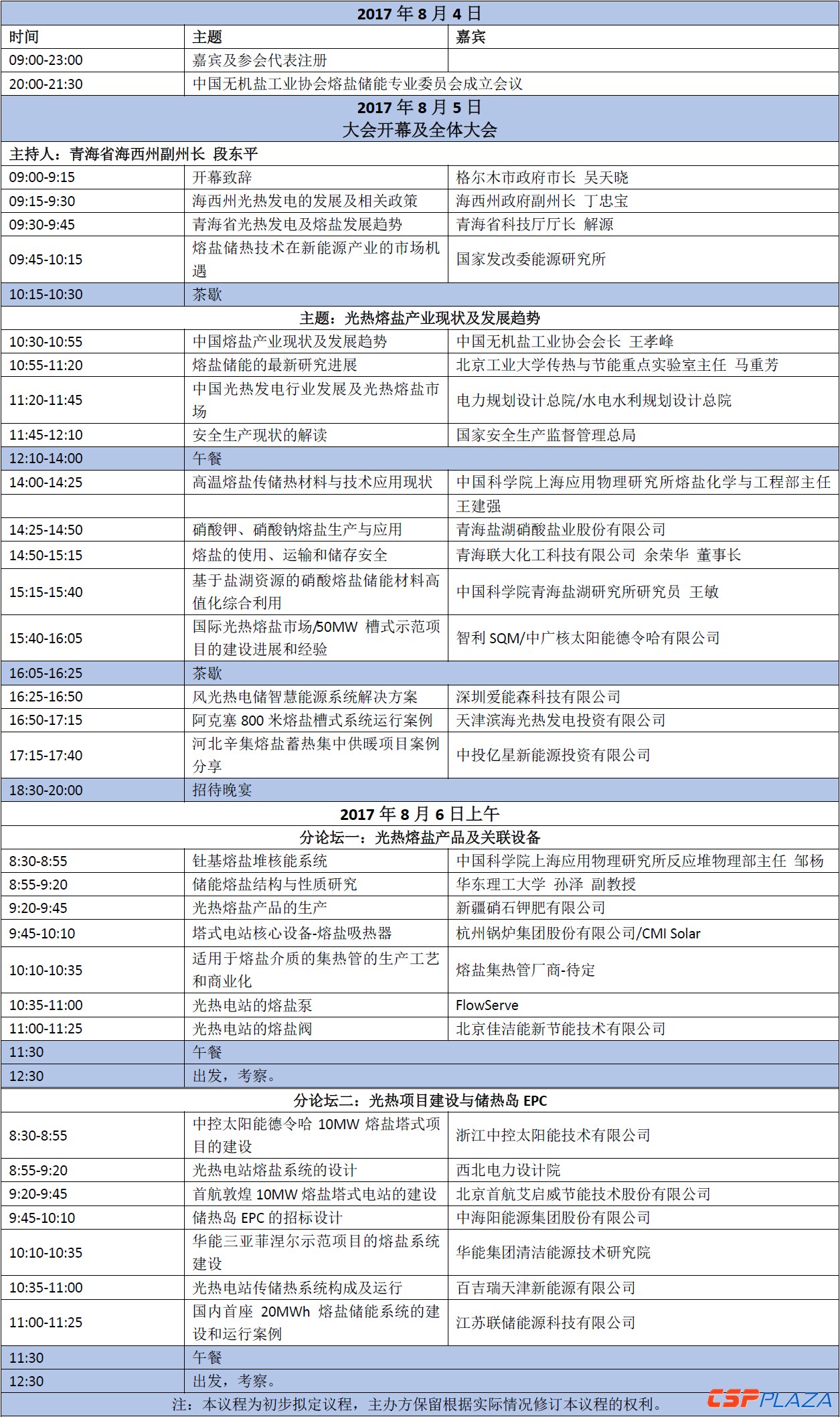 會議時間:8月4日全天報到,晚上8:00召開中國無機鹽工業協會熔鹽儲能專業委員會成立會議;8月5日全天大會主題報告;8月6日上午分設兩個專業論壇。