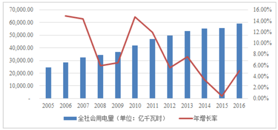 我國2005年至2016年全社會用電量及年增長率變化情況如下: