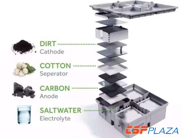 圖:Aquion電池組件的構成:陰極為土(含氧化錳),陽極為碳,電解液為鹽水