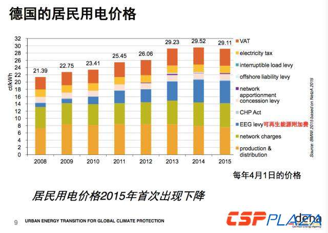 為解決這個問題,德國政府在2015年開始改變可再生能源固定電價補貼制度,推出招標電價制度,讓市場來確定電價。招標電價實行一年半的時間,德國可再生能源電價下降了10%-20%,居民用電價格2015年也首次出現下降。