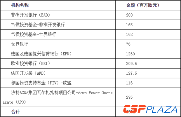 摩洛哥2009年宣布的2000MW太陽能項目所需資金巨大,約需90億美元,完全憑借摩本身財力難以承擔。據沙特ACWA集團披露,其中標的正在實施中的瓦爾扎扎特太陽能二期和三期項目資金構成為80%的債務和20%的自有資金。其中債務由摩洛哥太陽能署承擔,國際開發機構對其提供融資支持。