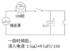 只有當介質吸收電流為0時,此時的流入電流才是漏電電流,這大概需要連續充電100個小時才能達到,此時漏電流大概為幾微安。在這個點以后,為了繼續測量流入電流,需要使用一只準確的微伏表與一只比較大的電阻,數值參看上圖。
