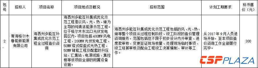 CSPPLAZA光熱發電網訊:近日,魯能海西州多能互補集成優化示范工程發布其全過程造價咨詢招標公告。據公告顯示,此次招標文件的獲取時間段為2017年9月1日至2017年9月7日(法定公休日、法定節假日除外),每日上午9:00時至11:30,下午13:30至17:00時(北京時間),投標文件遞交的截止時間與唱標時間均為2017年9月20日10:00。