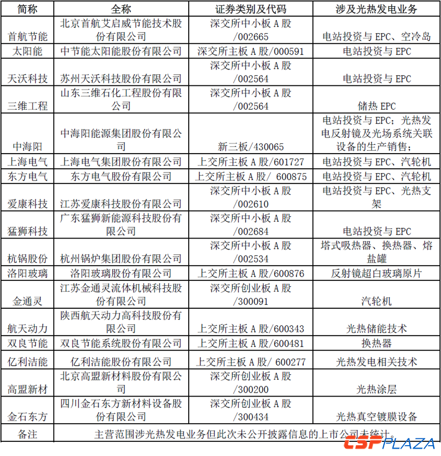 下表為涉及光熱發電業務上市企業的基本情況以及他們所涉及的光熱業務介紹(主營范圍涉光熱發電業務但此次未公開披露信息的上市公司未統計):