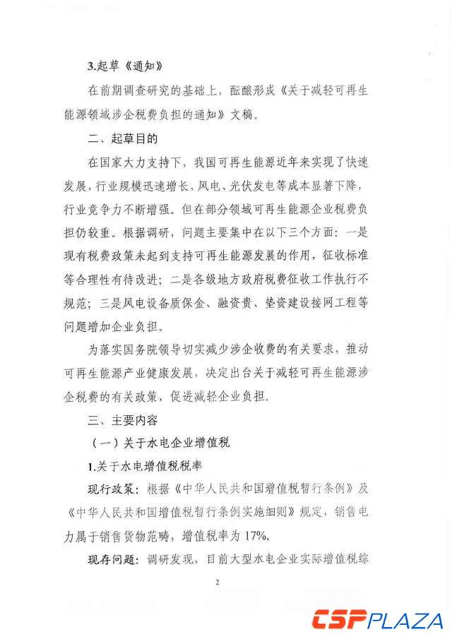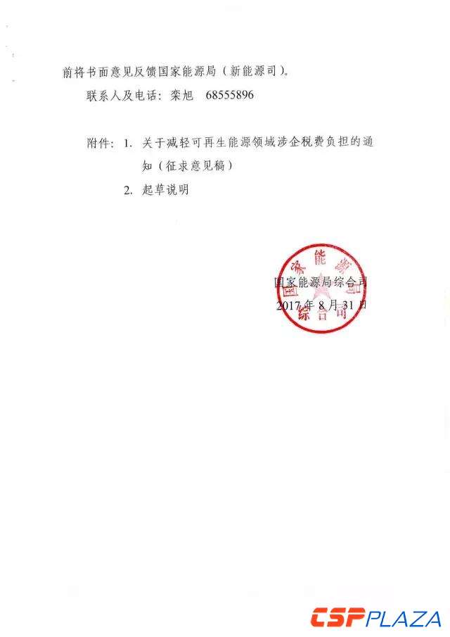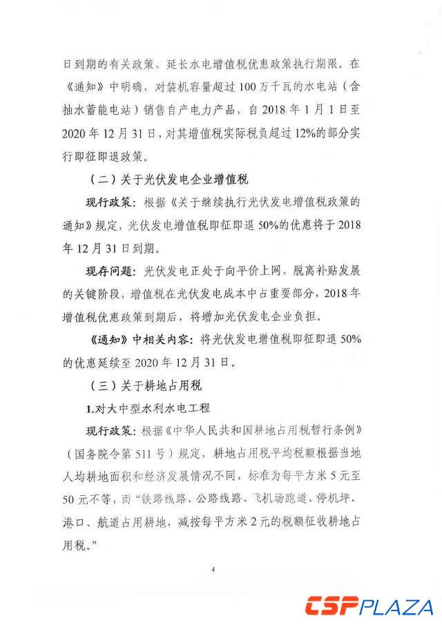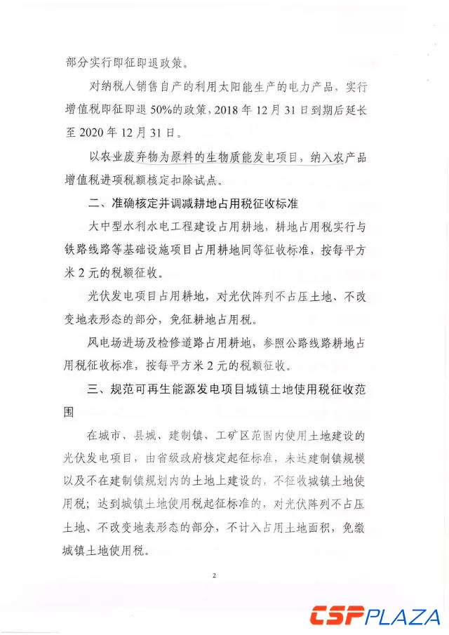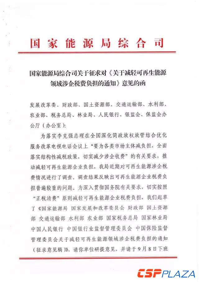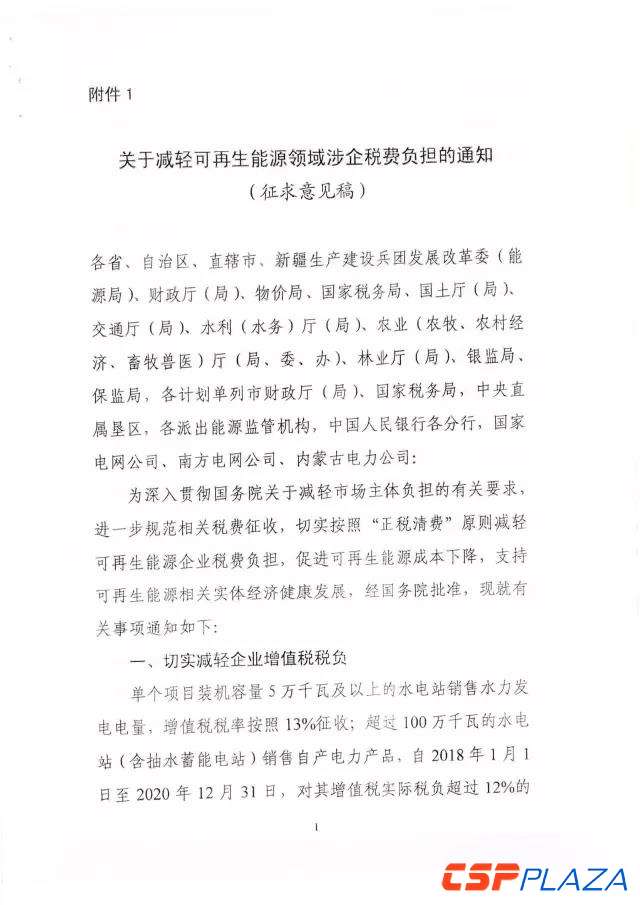 CSPPLAZA光熱發電網訊:近日,國家能源局綜合司下發了關于征求對《關于減輕可再生能源領域涉企稅費負擔的通知》(以下簡稱《通知》)意見的函。為切實減輕可再生能源企業增值稅稅負,《通知》強調,對納稅人銷售自產的利用太陽能生產的電力產品,實行增值稅即征即退50%的政策,從2018年12月31日延長到2020年12月31日。