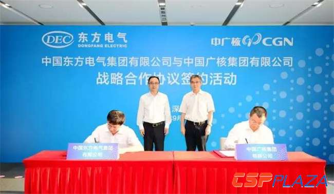 東方電氣集團董事會秘書、總法律顧問張繼烈和中廣核集團黨組成員、中廣核電力股份總裁高立剛分別代表兩集團簽署戰略合作協議。