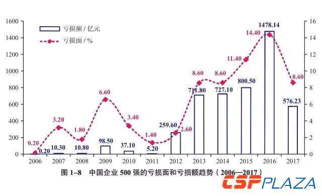 2017中國企業500強分析報告顯示,2017中國企業500強上榜企業虧損面和虧損額近五年來首次大幅減少。2017中國企業500強中,虧損企業有43家,虧損面為8.6%,虧損面較上年的14.4%大幅下降;43家企業的虧損額達到576.23億元,較上年也大幅下降。