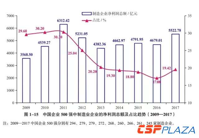 值得一提的是,在經過連續三年對鋼鐵、有色、煤化工等重化工行業實施了去產能等政策措施后,制造業企業利潤占比一改過去五年間凈利潤占比連續下降的態勢,在6年后首現反彈。2017中國企業500強中的245家制造業企業共實現凈利潤5493.10億元,占500強凈利潤總額的19.42%,較2016年提高了近2.34個百分點。