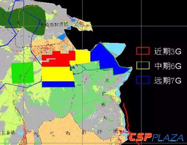 2、規劃裝機容量:擬規劃總容量為12.35GW。按照點聚焦(塔式)、線聚焦式兩種太陽能聚光方式進行規劃布置,計劃分三期建設,一期建設2.05GW,計劃2016年-2020年期間完成;二期建設5.3GW,三期規劃出500平方公里土地建設5GW。
