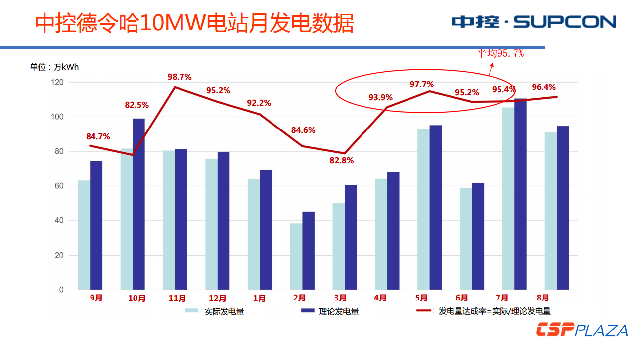 CSPPLAZA光熱發電網訊:“截至目前,中控10MW塔式熔鹽光熱電站運行穩定,累計發電量穩定持續增加,其中2016年11月份發電量達成率最高,為98.7%;10MW電站累計發電251天,累計發電量866萬kWh,達到年設計發電量的92.1%;2017年4-8月五個月時間內,10MW電站發電量達成率平均值為95.7%。”在9月22日—23舉辦的第二屆德令哈光熱大會上,浙江中控太陽能技術有限公司董事長金建祥首次披露了中控10MW塔式熔鹽光熱電站自2016年8月20日并網發電以來的運行數據。
