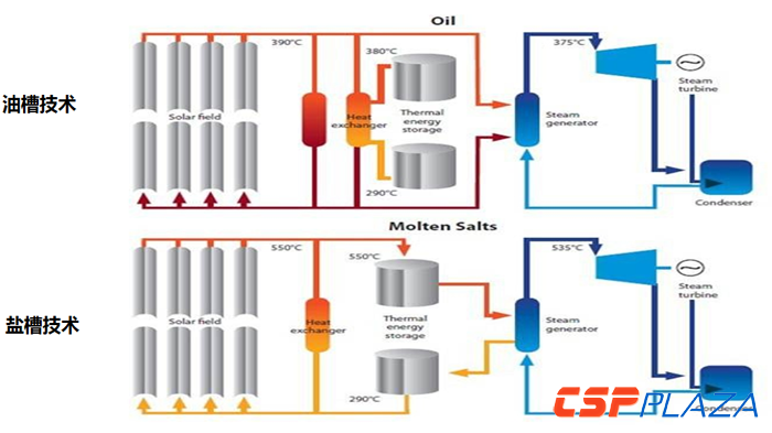 圖:熔鹽與導熱油槽式光熱發電系統原理圖對比
