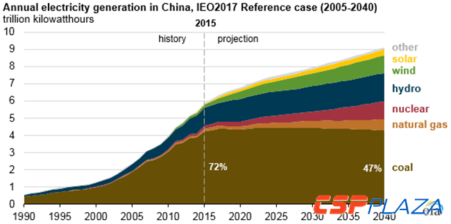 根據美國能源信息署(EIA),未來幾十年,可再生能源在中國發電量中的占比將增長,而燃煤發電的份額將從2015年的72%降至2040年的47%。