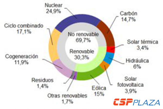 CSPPLAZA光熱發電網訊:根據最新數據,西班牙9月份光熱發電量占該國當月總發電量的3.4%,與本年5月份持平,但較6、7、8月份有所下滑。