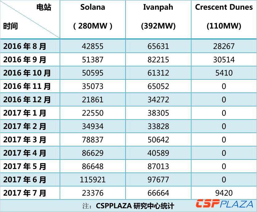 Solana槽式電站配6小時儲熱,設計年發電量為944000MWh,于2013年10月正式并網發電。Ivanpah塔式水工質電站無儲熱,PPA協議年供電量為975000MWh,于2014年2月13日正式并網投運。新月沙丘熔鹽塔電站配10小時儲熱,設計年發電量為500000MWh,于2016年2月份正式并網投運。這三個大型光熱電站自2016年8月至2017年7月的月度發電量如下表所示。