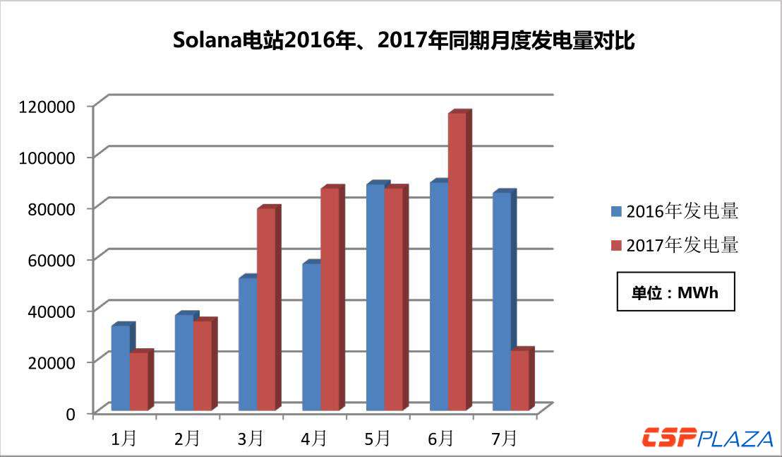 如圖所示,相較于2016年同期,Solana電站2017年3、4、6月的發電量顯著增長,而2、5月發電量與去年基本持平,1、7月則明顯低于7月。而2017年7月的發電量之所以銳減,應與電站在當月發生變壓器起火事故有關,阻礙了該電站當年再創新高的可能。