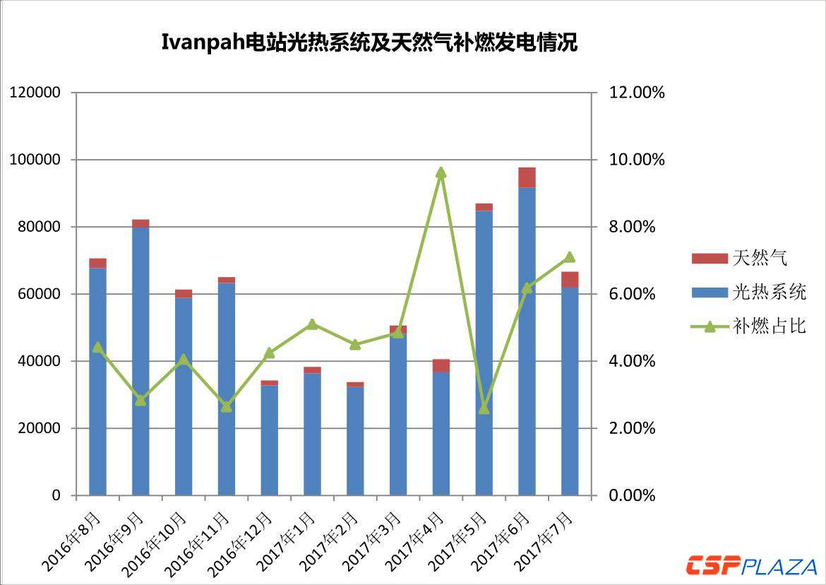 Ivanpah電站在2016年8月至2017年7月的天然氣補燃占比如圖所示: