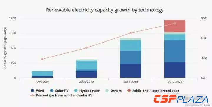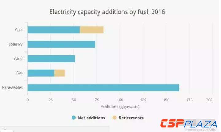國際能源署發布2017年可再生能源報告,確認2016年全球新增可再生能源裝機165吉瓦,其中太陽能光伏裝機達到74吉瓦(約46%來自中國),首次超過煤電新增裝機(57吉瓦)。