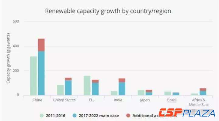 過去對于可再生能源發展規模預測曾經偏保守的IEA現在預測,2017-2022年間全球可再生能源新增裝機將至少達到920吉瓦(其中風電321吉瓦、光伏438吉瓦),其中363吉瓦(39%)將來自中國。如果各國政策支持力度加大的樂觀情形下,2017-2022年間可再生能源新增裝機可能達到1150吉瓦,其中464吉瓦(40%)來自中國。