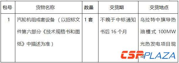 CSPPLAZA光熱發電網訊:10月16日,烏拉特中旗導熱油槽式100MW光熱發電項目發布其汽輪機組成套設備招標公告。據公告顯示,本次招標文件的獲取時間段為2017年10月16日至2017年10月20日,每天8:30—17:00(北京時間),投標截止時間和開標時間均為11月6日。