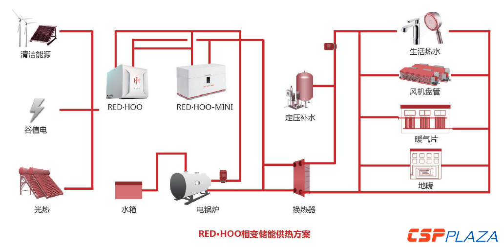 經過多年研發的華厚能源在此領域便憑借其獨創的相變儲能材料組合,實現了溫度區間的全覆蓋,無源冷鏈(<-18℃)、相變蓄冷(8~9℃)、被動式節能建筑(22~29℃)儲能熱泵(45~58℃)、區域供熱(75~80℃)、集中供熱(150~170℃)、中高溫余熱回收(200℃以上)。通過使用獨家研發的相變材料,結合存儲電鍋爐、燃氣鍋爐、熱泵、制冰機等設備產生的冷和熱,用于提供生活熱水、冬季采暖和夏季供冷、冷庫制冷等。截止目前,華厚能源開發出了RED.HOO、BLUE.HOO、RED.HOO-PLUS等系列相變儲能供熱與蓄冷產品,并推出了與這些系統相配套的云控制系統-CLOUD.HOO以及APP產品-COLOR.HOO。