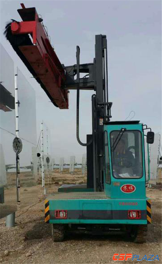 主營叉車的鎮江蘇福機械有限公司通過持續的研發投入,成功研制出針對塔式平面反射鏡的太陽能定日鏡專用清洗車,目前已在國內部分項目上試用,效果良好。