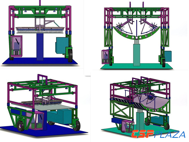 此外,國內清洗車供應商寧波跨越太陽能板清洗車有限公司開發了一款可應用于塔式和槽式光熱電站的跨越式清洗車輛,采用高壓柔條刷滾水洗、高壓吹風和高壓除塵三種組合方式,具有整機結構簡單、操作控制方便、晃動損傷減輕、運行平穩高效、轉彎靈活方便及場地利用率高的特點,同時,該公司還自主研發了適用于沙漠等軟土地面的履帶式龍門清洗車。此外,針對西北地區寒冷條件下鏡面易結冰的現象,其還提出了采用暖風吹塵干洗的措施。(如下圖所示)