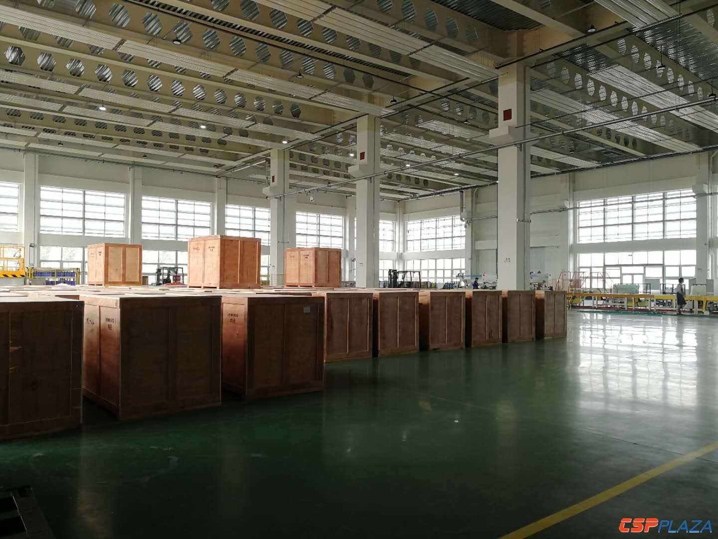 CSPPLAZA在調研活動期間參觀了其正在運轉的超薄反射鏡生產線,從意大利Reflex引進的超薄反射鏡生產技術在這里實現了本土化生產,1mm的超薄反射鏡粘貼在樹脂成型背板材料上,實現了96%以上的反射率,在其廠房內,為其阿克塞50MW電站生產的反射鏡整齊排列,正待發往項目現場。同時,其跟蹤系統車間也已投入運行,現也處于生產期。其它相關工廠尚在建設中。