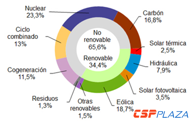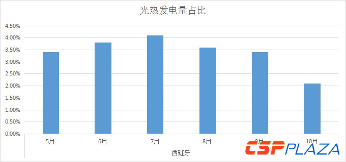 據CSPPLAZA此前報道,西班牙5、6、7、8、9月份光熱發電量分別占當月總發電量的3.4%、3.8%、4.1%、3.6%與3.4%。