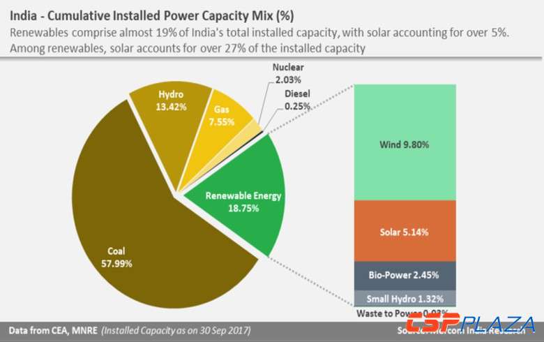 根據Mercom資本集團,截止9月底,可再生能源占印度電力裝機容量的19%。