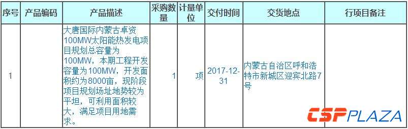 CSPPLAZA光熱發電網訊:11月14日,內蒙古大唐國際卓資新能源有限責任公司100MW光熱項目初可研詢價公布詢價結果公告。根據公告,內蒙古電力勘測設計院有限責任公司為本次詢價成交供應商,交貨時間為2017年12月31日。