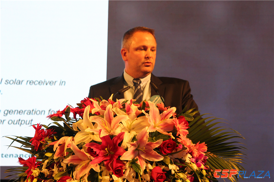 而在接下來的業務版塊介紹中,CMI太陽能公司總裁Eric Absil也與諸位嘉賓分享了CMI在光熱發電領域的發展情況。據Eric Absil介紹,其已為南非裝機50MW的Khi Solar One塔式光熱發電項目提供三腔式水工質吸熱器已經成功的投入商業運行。在熔鹽吸熱器方面,CMI已掌握適用于熔鹽工質的吸熱器的生產和制造技術,并已申請并獲得多項專利。該吸熱器主要管材采用inconel材料,可在表面溫度達700℃的狀態下工作。據悉,CMI為智利Acatama1的110MW儲熱時長達17.5小時的的熔鹽光熱電站提供的吸熱器所有部件已全部抵達現場,預計將很快投入安裝和運行。