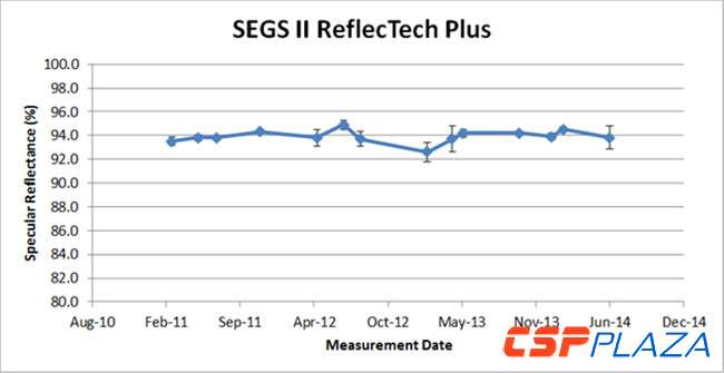 圖:ReflecTech在SEGSII光熱電站中反射率表現情況