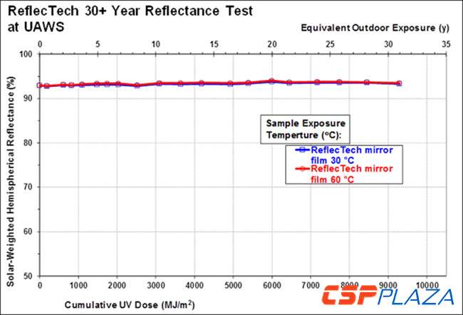 值得注意的是,在長期的超加速風化系統(UAWS)耐候性測試中,ReflecTech反射鏡膜以反射性能幾乎沒有衰減的優異成績通過了測試,得出了其光學耐久性可達30多年的結論。