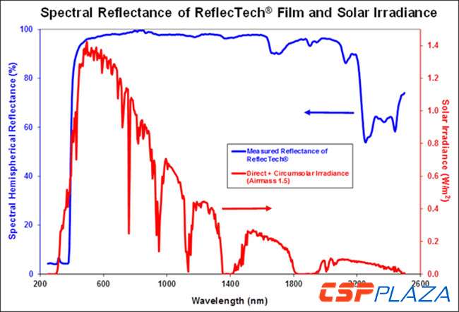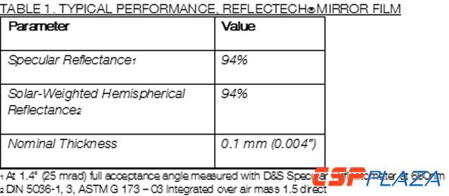 由ASME 2009此前所發表的論文顯示,ReflecTech? 反射鏡膜具有94 %的太陽能加權半球反射率和在660 nm及25-mrad (1.4°) 全接受角的94%的鏡面反射率(詳見下表)。此性能與應用于CSP產業的玻璃反射鏡的性能是相當的。