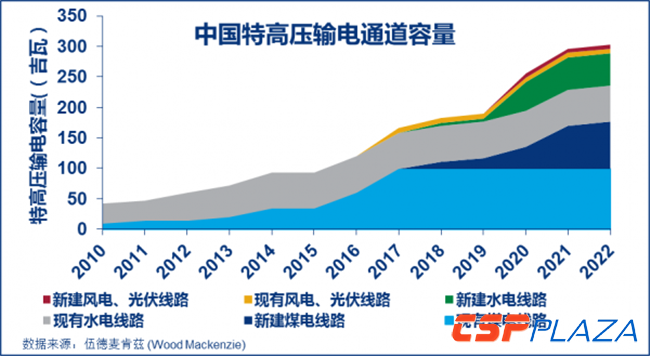 特高壓輸電最初是為了滿足東部地區電力需求而興建的,但隨著近年來中、東部地區霧霾污染的加劇,國家進一步強化了特高壓輸電通道的“治霾”屬性。2013年大氣污染防治行動計劃特別提出興建12條跨區輸電通道作為污染治理的重要組成部分,其中包括8條特高壓交、直流輸電線路。根據伍德麥肯茲的統計,截至2017年底中國將擁有總計166吉瓦的特高壓輸電容量,其中約六成為煤電線路。最近中國又宣布將建設約33吉瓦的特高壓線路專門用于輸送西南地區的水電。我們預計到2022年,中國的特高壓輸電容量將快速攀升達到約300吉瓦。