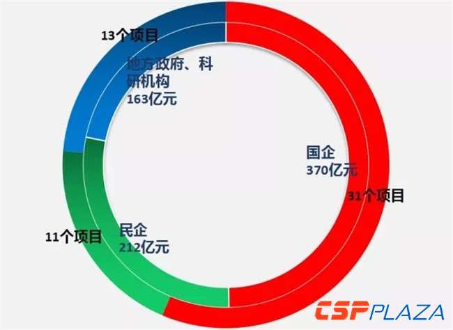 首批示范項目投資主體包括國企31家,投資金額370億元;民企11家,投資金額212億元;其他包括地方政府、科研機構13家,投資金額163億元。