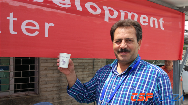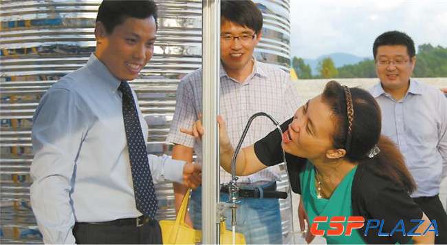 圖:太陽能光熱海水淡化站示范工程產出直飲水(左一為彭志剛)