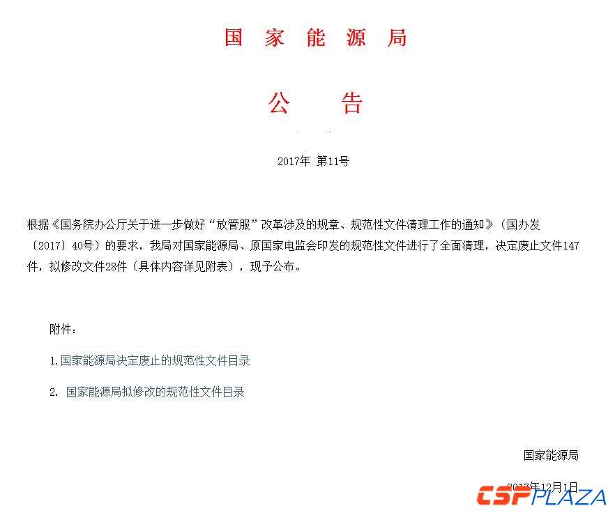 CSPPLAZA光熱發電網訊:12月11日,國家能源局根據《國務院辦公廳關于進一步做好“放管服”改革涉及的規章、規范性文件清理工作的通知》(國辦發〔2017〕40號)的要求,對國家能源局、原國家電監會印發的規范性文件進行了全面清理,決定廢止文件147件,擬修改文件28件。