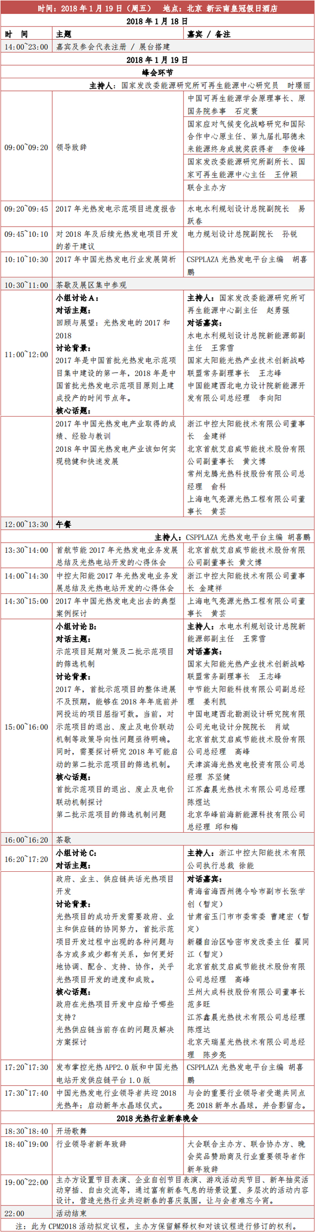 CSPPLAZA光熱發電網訊:由CSPPLAZA主辦、常州龍騰光熱科技股份有限公司聯合協辦的2018中國光熱發電產業回顧與展望領導者峰會暨CSPPLAZA2018新年匯(CPM2018)將于1月19日在北京盛大召開,大會詳細議程今日正式發布。
