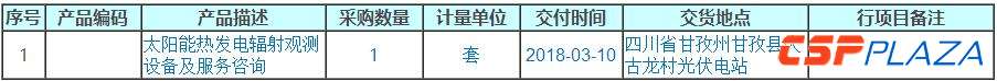 根據公告,本項目詢價范圍為1套太陽能熱發電輻射觀測設備及服務咨詢,交付時間為2018年3月10日,交貨地點位于四川省甘孜州甘孜縣火古龍村光伏電站。