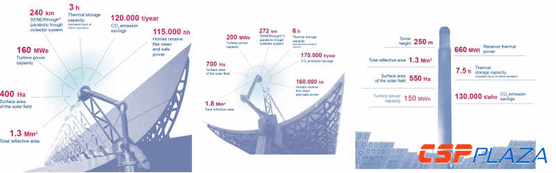 圖:瓦爾扎扎特500MW太陽能發電園區項目包含了NoorI(左),NoorII(中)和NoorIII(右)(圖片來源:SENER)