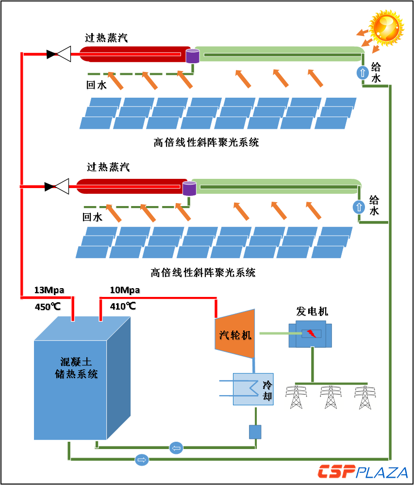 ▌大規模混凝土固態儲熱系統,進一步平滑穩定蒸汽參數。鏡場聚光集熱產生的蒸汽既可以在晴朗天氣時段,由旁路分出部分汽量直推汽輪機,也可以把較復雜光照時段或參數不夠穩定的蒸汽全部送往大規模混凝土固態儲熱系統進行分類儲存,汽輪機則可以由儲熱系統輸出單元產生的參數穩定的蒸汽進行推動,這是實現充分利用各類光照資源、確保持續穩定發電輸出的系統性關鍵環節。