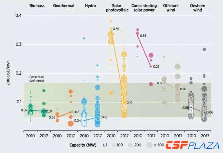 ——光熱發電:2017年LCOE為0.22美元/千瓦時,比2010年(0.33美元/千瓦時)下降33%