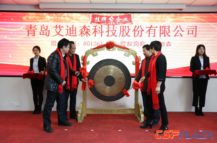 2017年12月29日上午11時38分,萊西市金融辦副局長馬建濤、萊西市姜山鎮副鎮長葛華與公司董事長王照忠,首席技術官李永臣,共同舉錘敲鑼。伴隨著響亮的鑼聲,青島艾迪森科技股份有限公司在青島藍海股權交易中心的掛牌圓滿完成。