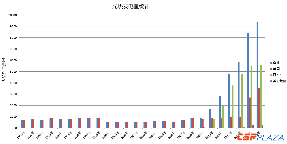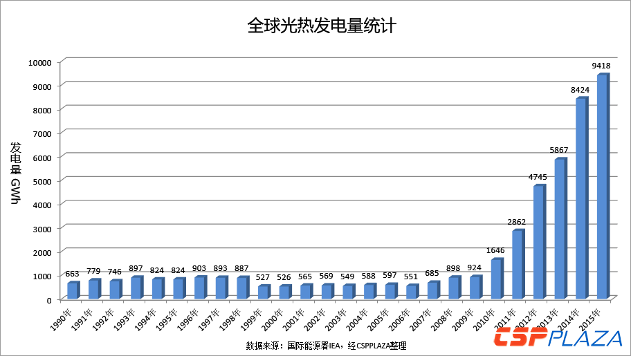 CSPPLAZA研究中心:光熱發電自1980年代邁入商業化進程已30多年,其在全球電力供應結構中的地位逐步提升,從1990年到2015年,全球光熱發電的總發電量由663GWh增加到9418GWh,增幅1320%。