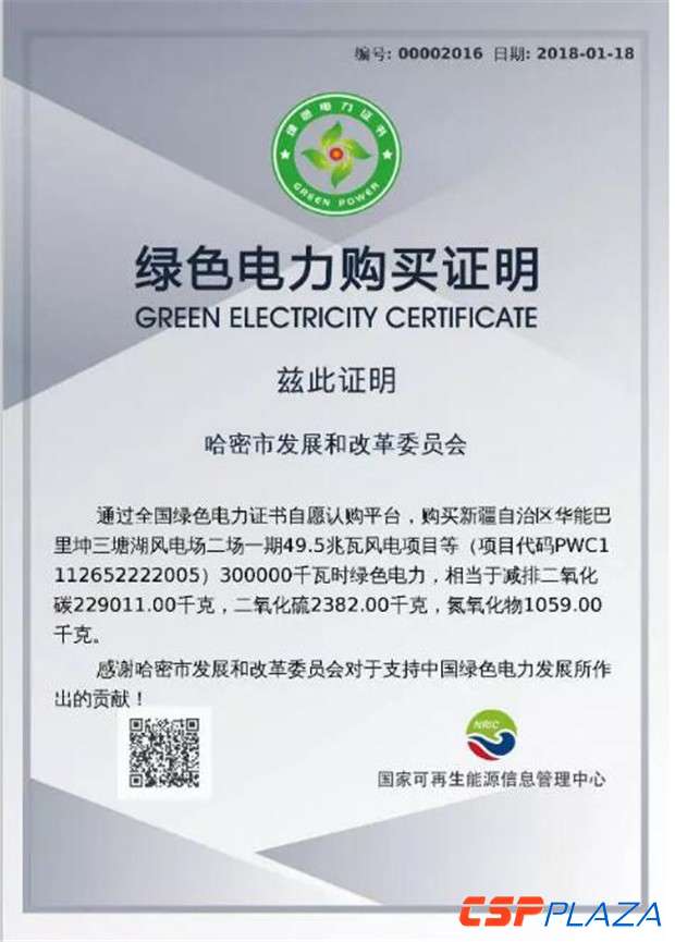 今年1月18日,國家可再生能源信息管理中心收到中國綠色電力證書認購交易平臺傳來的最新消息,新疆哈密市發改委代表哈密市人民政府購買了300個綠證。此舉踐行了哈密市人民政府在綠證自愿認購啟動儀式上的認購承諾,成為地方政府層面消費綠色電力、踐行綠色消費理念的引領者。