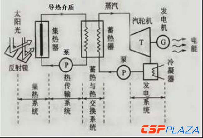 太陽能熱發電是將太陽能轉化為熱能,再將熱能轉化為電能的全新新能源應用技術,它利用各種聚光鏡面聚集太陽的直接輻射,加熱導熱介質,經熱交換產生高溫高壓的蒸汽,蒸汽驅動汽輪機發電。通過熱交換器后的導熱介質流體返回集熱場再次加熱,同時在系統中設置儲熱罐,存儲富余的熱能量,在太陽能不足時對系統進行補給,從而加大了太陽能的利用效率。