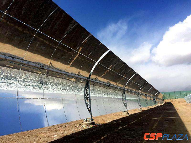 中廣核德令哈槽式光熱發電項目位于青海省海西州德令哈市太陽能工業園區,于2013年2月5日取得青海省發展改革委項目核準批復,由中廣核太陽能德令哈有限公司投資建設,采用拋物面槽式導熱油太陽能熱發電技術,建設190個槽式集熱器標準回路,配套9小時熔融鹽儲熱系統,光電系統轉換效率14.03%,占地面積約2.6平方公里,采光面積約62萬平方米,發電裝機容量5萬千瓦,項目利用亞開行低息貸款,總投資17億元。同時項目是國內首個開工的大規模商業化光熱發電項目,于2014年7月開工建設,2015年的8月主體施工安排進場,截至目前,全場設備和工程采購完成100%,已完成基礎建設和部分安裝作業。預計項目投運時間為2018年6月28日。項目送出線路計劃接入青海省發展投資有限公司投資建設的柏樹新能源匯集站。
