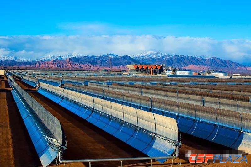 摩洛哥努奧二期200兆瓦光熱電站,是目前全球單機容量最大的槽式光熱電站。電站采用拋物線槽式太陽能聚熱發電技術,通過弧度鏡反射太陽光線,加熱導熱油,產生高溫蒸汽,帶動發電機進行發電。同時,吸熱系統將部分熱量儲存到儲熱罐中,在晚間進行發電。這一技術,可使電站每天發電17個小時,且整個發電過程不產生任何污染,解決了硅晶板光伏電站無太陽光就不能發電的問題,是目前全球最先進的清潔能源技術。